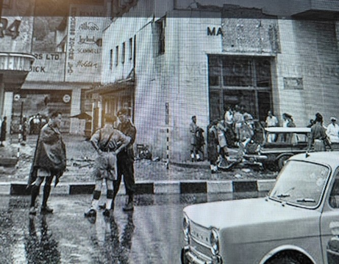 Macdonald House Blast. My father (police officer) is facing away from the photo. Circa 1965.